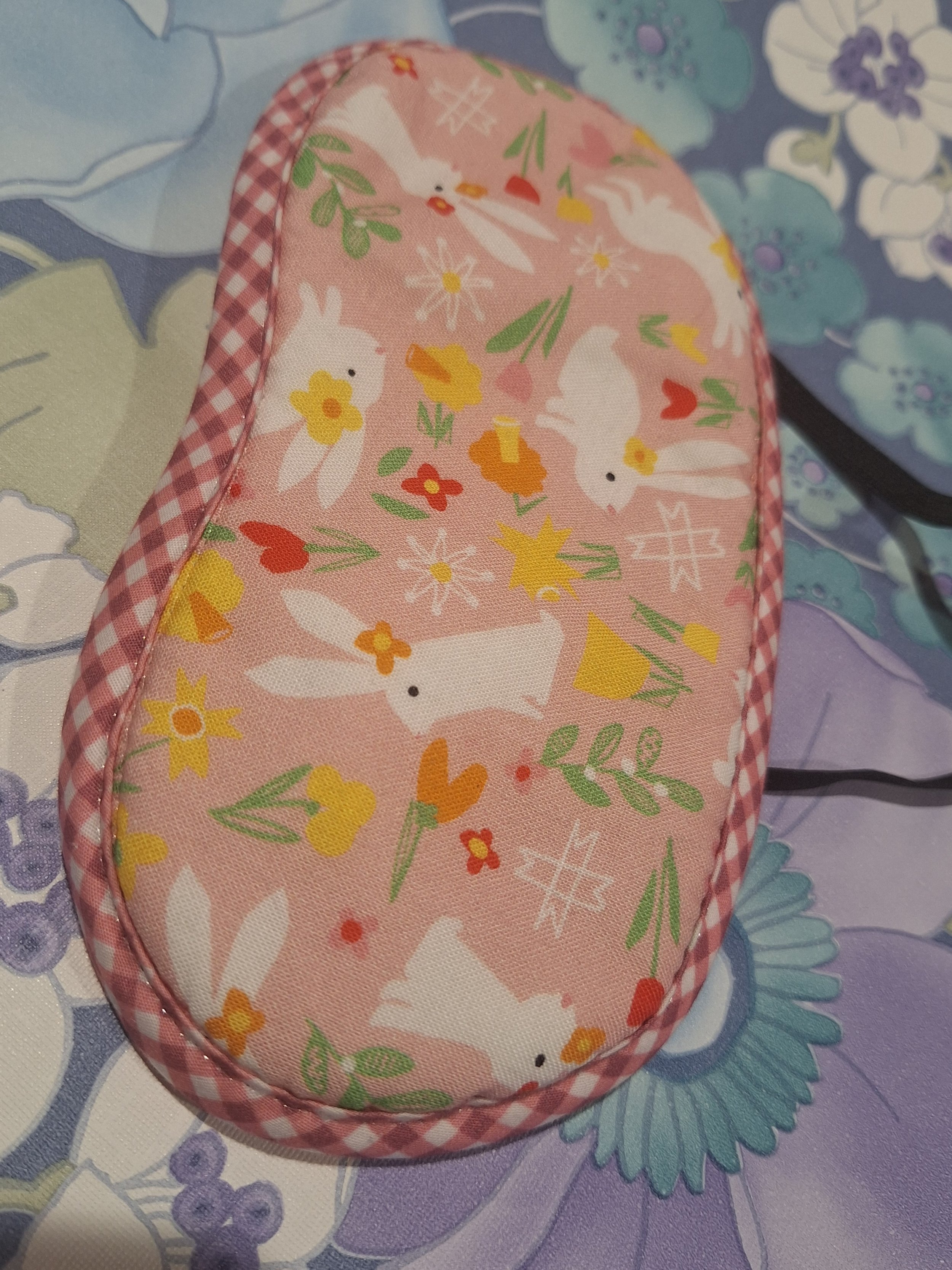 19 years ago I looked back on the plane and everyone had these beige eye masks on, and it was then that I knew something had to be done. Modelled on the air craft carrier size I use a mix of vintage and new fabrics for the pretty outside, lined with cotton batting and black cotton fabric on the back. Each eye mask is then edged with a funky 100% cotton bias binding around the edge. Each eye mask is kept in place by 5-6mm black elastic.