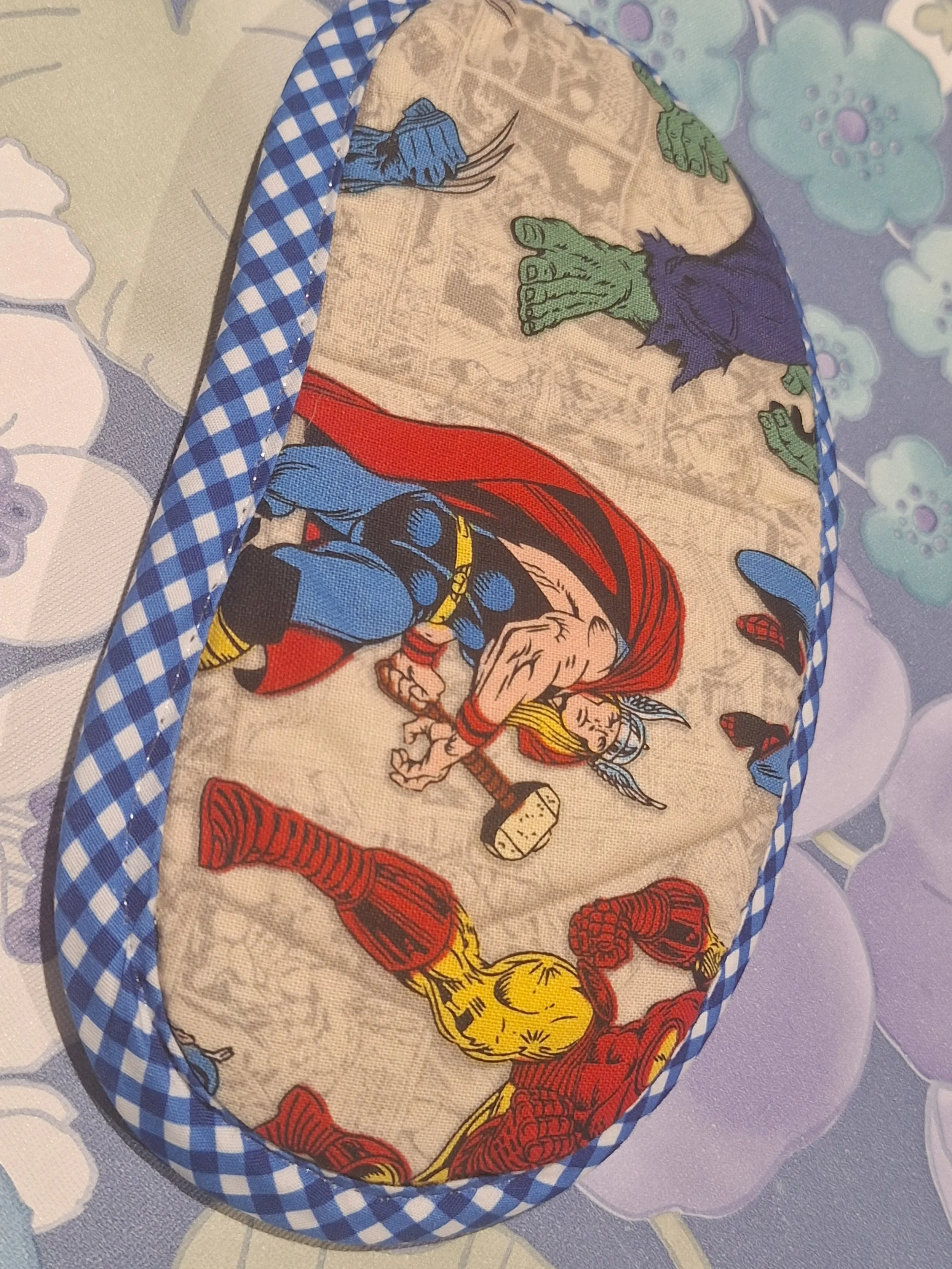 19 years ago I looked back on the plane and everyone had these beige eye masks on, and it was then that I knew something had to be done. Modelled on the air craft carrier size I use a mix of vintage and new fabrics for the pretty outside, lined with cotton batting and black cotton fabric on the back. Each eye mask is then edged with a funky 100% cotton bias binding around the edge. Each eye mask is kept in place by 5-6mm black elastic.