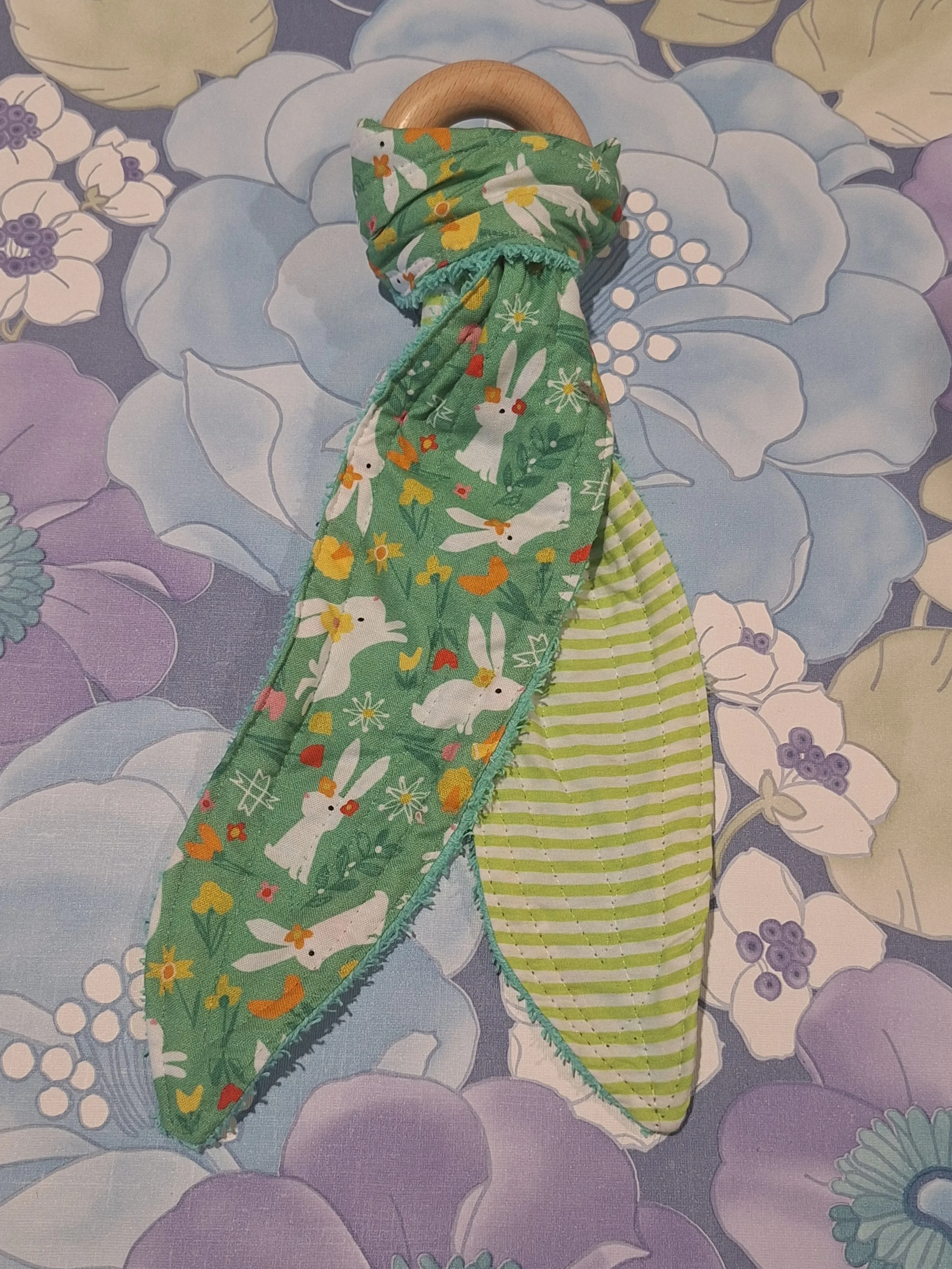 Lightweight, easy to grip, and made with soft cotton fabric with absorbent backing and a natural beechwood ring- practical for babies and stylish parents